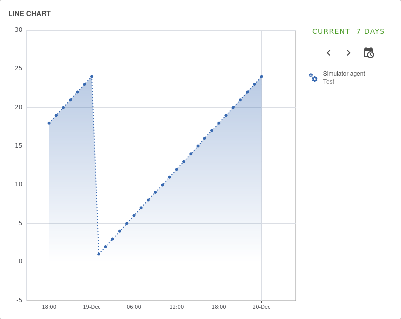 Attributes linked to this agent that have a replayData field in their Agent Link will cause the values within to be replayed over a 24h period in a continuous loop, unless a schedule is configured. Each SimulatorReplayDatapoint value must have a timestamp (seconds offset from midnight 00:00 in the system time of the machine that hosts the manager) and a value, this value will then be written to the attribute at the specified seconds offset from midnight each day.