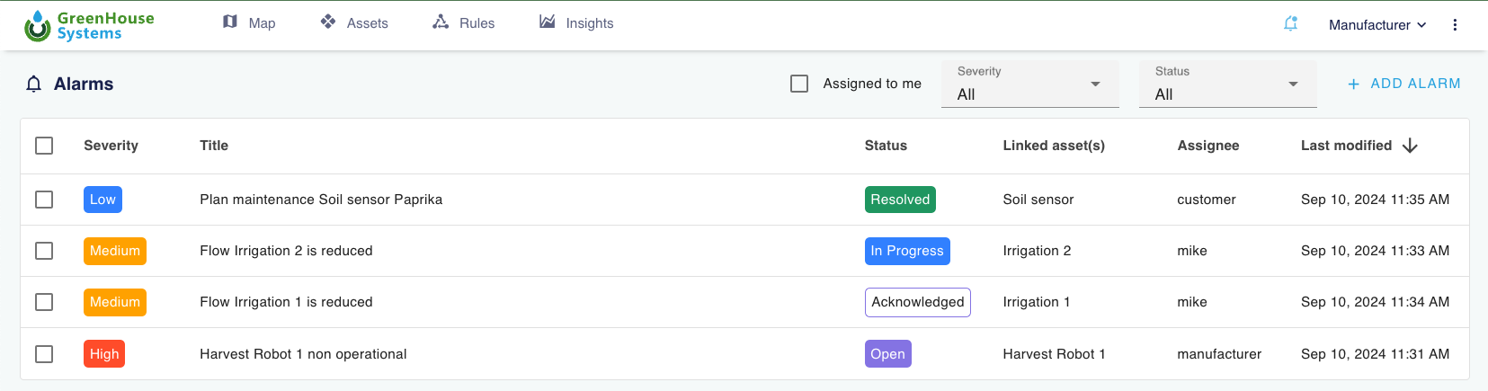 The alarms functionality (top right) allows you to automatically generate alarms, assign them to users, and track their status. You can also see an overview of alarms assigned to you, and high priority alarms are automatically send to assigned persons. These features are supported: