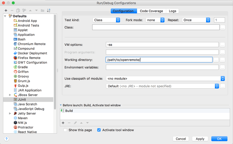 We recommend you set this as the default directory in your IDE for all Run Configurations. To improve creation and execution of ad-hoc tests in the IDE you should set the default working directory for JUnit Run Configurations: