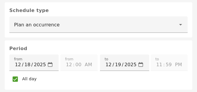 The schedule can be set to occur only once by selecting "Plan an occurrence". This will allow a period to be specified where the data will be replayed. Any datapoints specified to be replayed after the end date are ignored.