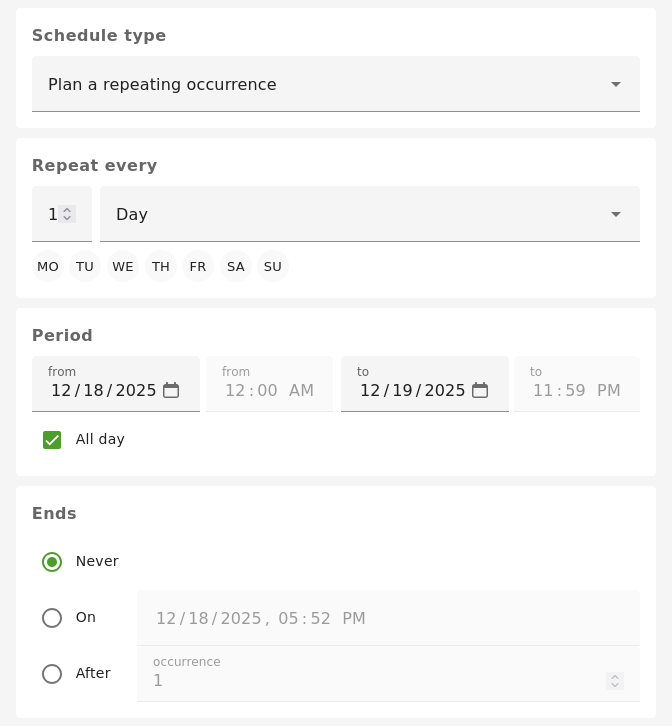 The repeating occurrence ending can be specified to stop at a certain date and time or set to end after a certain amount of occurrences.