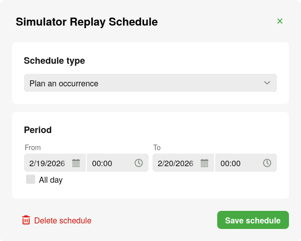 The schedule can be set to occur only once by selecting "Plan an occurrence". This will allow a period to be specified where the data will be replayed. Any datapoints specified to be replayed after the end date are ignored.