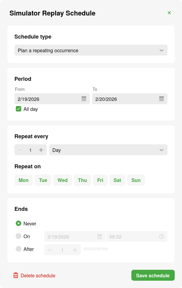 The dataset can also be replayed recurringly by selecting "Plan a repeating occurrence". In addition to the period options this allows a frequency to be specified and how the repeating occurrence ends.
